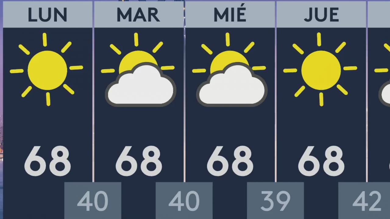 Para este lunes predominarán las condiciones soleadas, con temperaturas máximas cerca de los 70 grados.