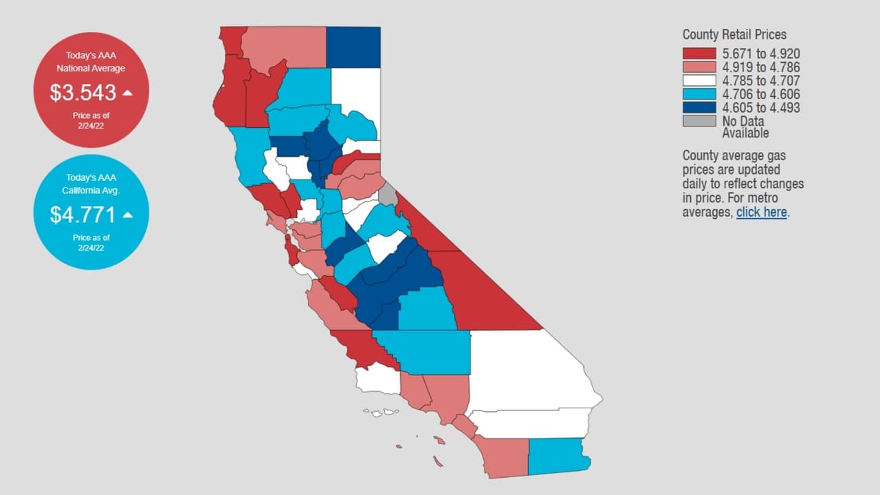 La Asociación Estadounidense de Automóviles reportó que precio promedio de la gasolina en California alcanzó los $4.77 por galón el jueves, que es más alto que el promedio nacional de $3.54 por galón.