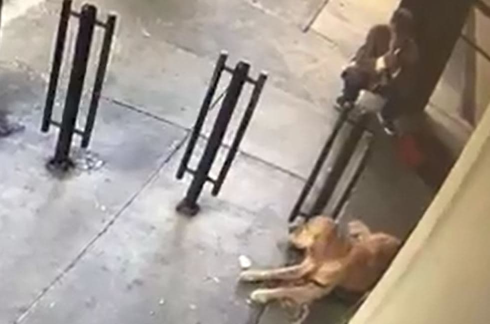 El video de vigilancia de la tienda muestra al sospechoso arrodillado cerca de la perra, desatando la correa del poste y llevándose a la perra.