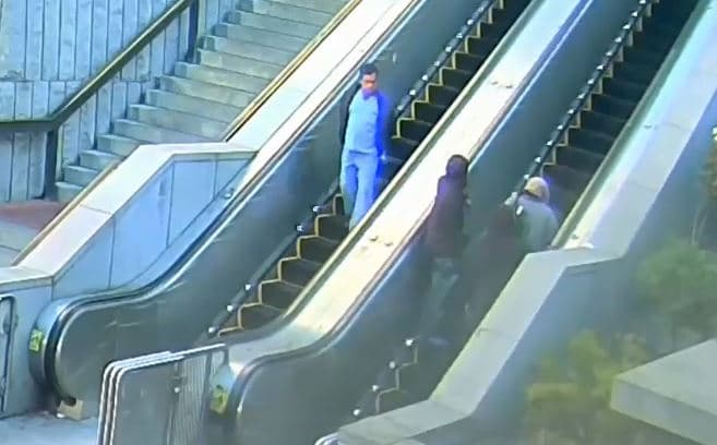 En el video se puede ver como dos hombres con sudaderas negras con la capucha puesta, se acercan por detrás a una mujer que está subiendo la escalera eléctrica. Uno de los sospechosos está justo detrás de la víctima y el otro sujeto está a un lado mientras los dos voltean a ver a sus alrededores.