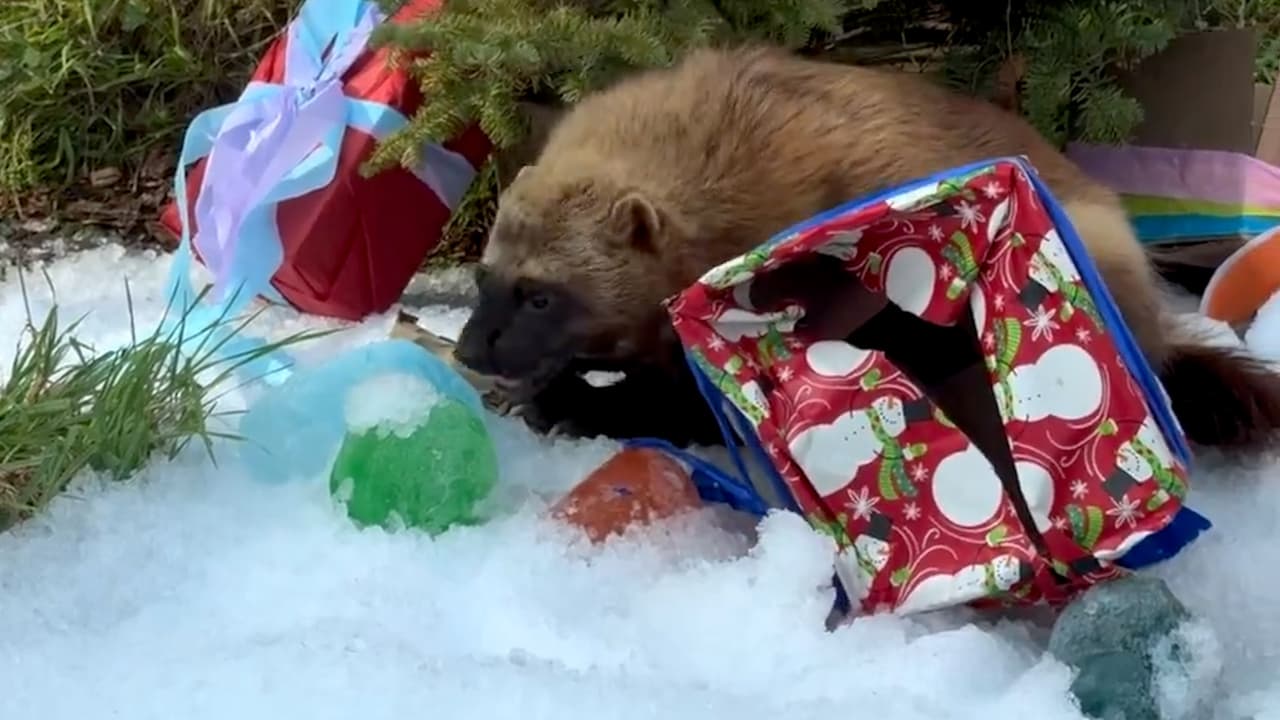 Este curioso glotón juega con regalos de Navidad en el zoológico de San Francisco
