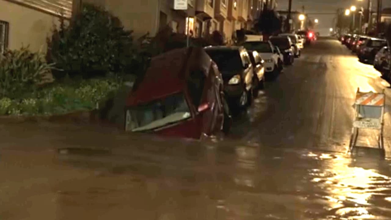 El momento en que una camioneta estacionada se hunde en un socavón que se abrió en Daly City