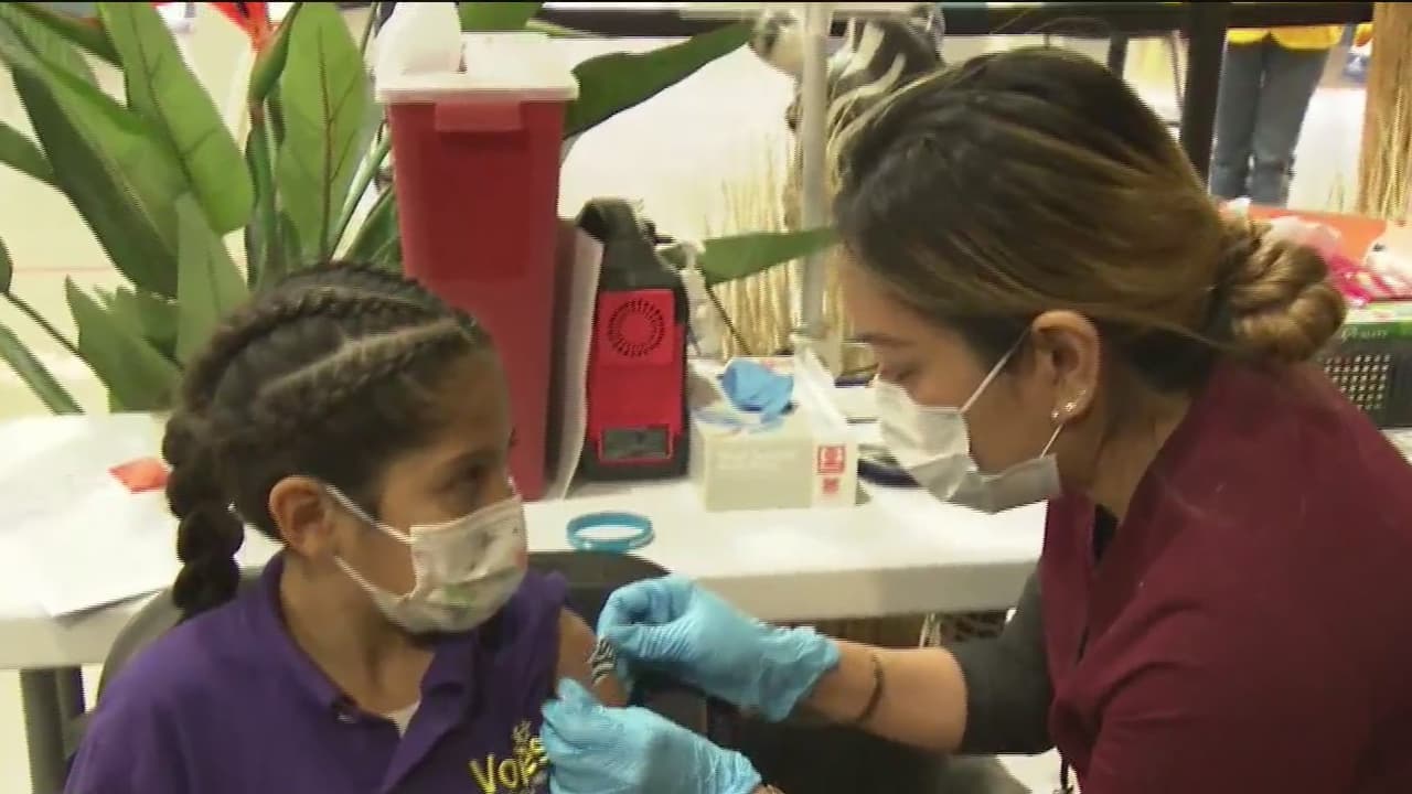 El sitio de vacunación masiva para niños entre 5 y 11 años en la feria del condado de Santa Clara cuenta con juegos y figuras inspiradas en una selva tropical. El objetivo es crear un entorno amigable para los menores mientras se vacunan contra el coronavirus.