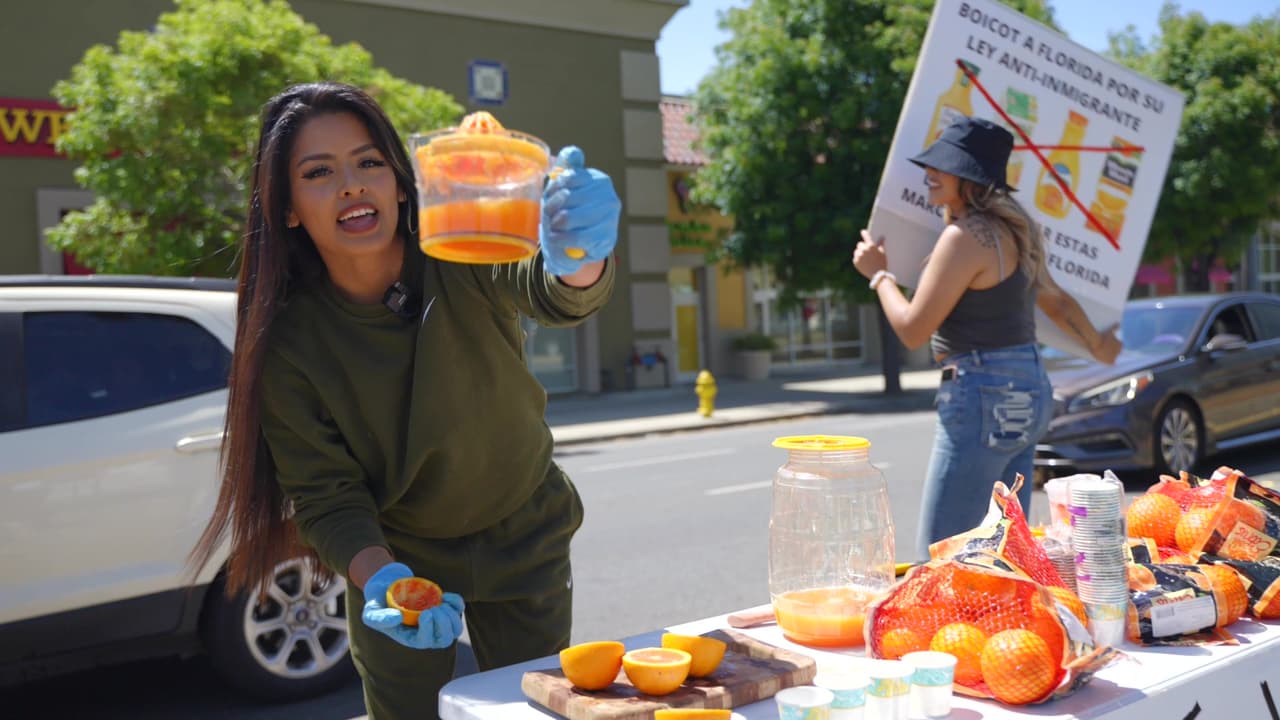 Activistas protestaron contra Ron DeSantis y sus leyes contra los inmigrantes en Florida. Flor Martínez, una de las activistas, pidió no comprar jugos de ese estado y, para llamar la atención, exprimió y regaló jugo de naranja.