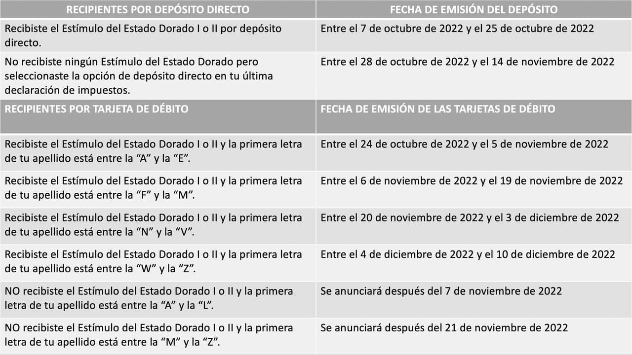 Los pagos se comenzaron a enviar desde el pasado viernes 7 de octubre y los primeros beneficiaros han sido aquellos que recibieron el primero o el segundo Estímulo del Estado Dorado y que además eligieron el depósito directo a sus cuentas bancarias como el método para recibir su reembolso de impuestos.