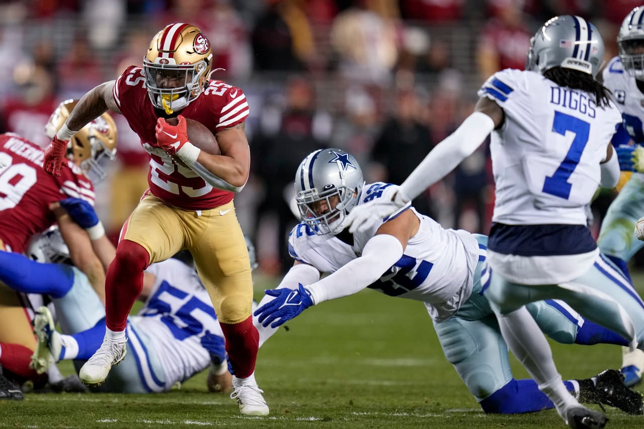 Los San Francisco 49ers van a su segundo juego consecutivo por el título de la Conferencia Nacional con una victoria el domingo de 19-12 sobre los Cowboys de Dallas. En la foto, Elijah Mitchell, número 5 de los San Francisco 49ers lleva el balón contra los Dallas Cowboys durante el último cuarto en el juego de Playoff Divisional de la NFC en el Levi's Stadium el 22 de enero de 2023 en Santa Clara, California.