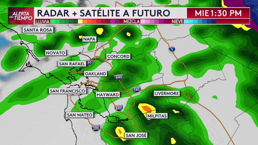 Para las 9 pm, las lluvias se habrán ido de San Francisco, pero aún seguirán en San José y la Costa Central. Se comienza a despejar un poco la zona de Merced, pero persisten los chubascos en Fresno, Visalia y Baskerfield.
