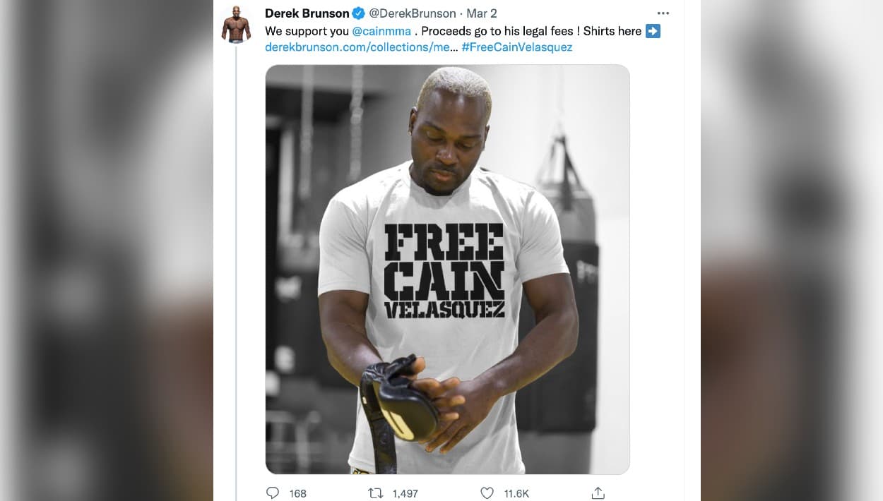 El expeleador de la UFC, Derek Brunson, anunció en Twitter que vende camisetas con la leyenda ‘Free Cain Velasquez’ y ya donó $10,000 para su defensa.