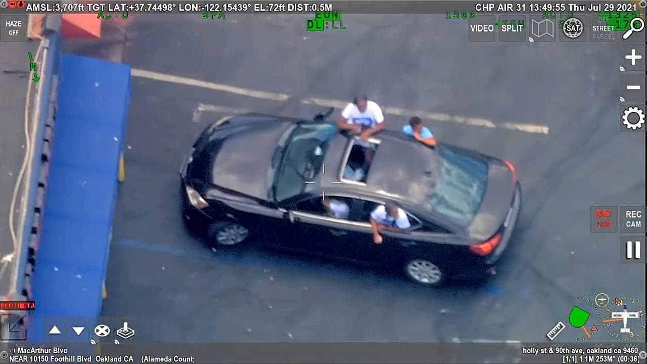 Un helicóptero de la Patrulla de Caminos de California ayudó a la Policía de Oakland a seguirle la pista a varios conductores que manejaban en sentido contrario y con pasajeros asomando sus cuerpos por las ventanas, poniendo el riesgo a otros automovilistas.