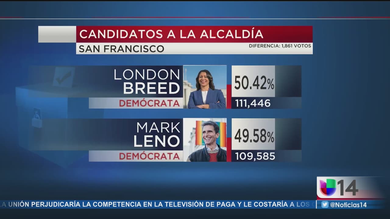 La cerrada contienda por la alcaldía tiene a London Breed en el primer lugar con el 50.42 % y a Marl Leno en el segundo lugar con el 49.58% por lo que podrían pasar varios días para que se conozca al ganador.