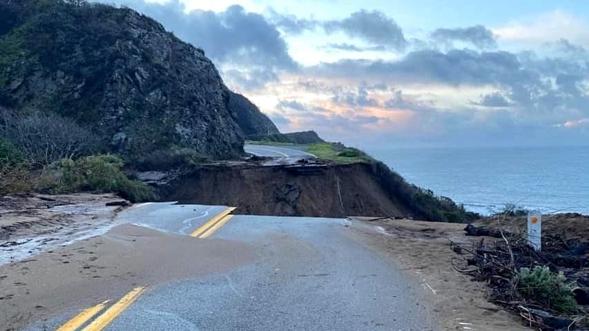 Las lluvias torrenciales que llegaron acompañadas del río atmosférico provocaron un deslave que derribó un gran pedazo de la famosa autopista 1 en el condado de Monterey, a unas 15 millas de la zona de Big Sur.