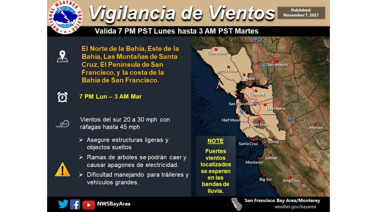 El aviso de viento ya está en vigor para las bahías norte y este, San Francisco y gran parte South Bay, excluyendo al Valle de Santa Clara desde el lunes por la noche y hasta la madrugada del martes.