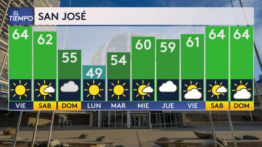 Durante las primeras horas de la mañana las temperaturas permanacerán por debajo de los 45 F hacia Santa Rosa y Napa. San José y San Francisco entre 45 y 50 F. Veremos niebla hacia San Francisco, San Rafael y Santa Rosa. Las temperaturas en la tarde oscilarán entre los 59 F hacia San Francisco y Oakland, 64 F en San José y 67 F hacia Santa Rosa. Para este domingo llega un frente frío con ligeras lluvias y vientos.