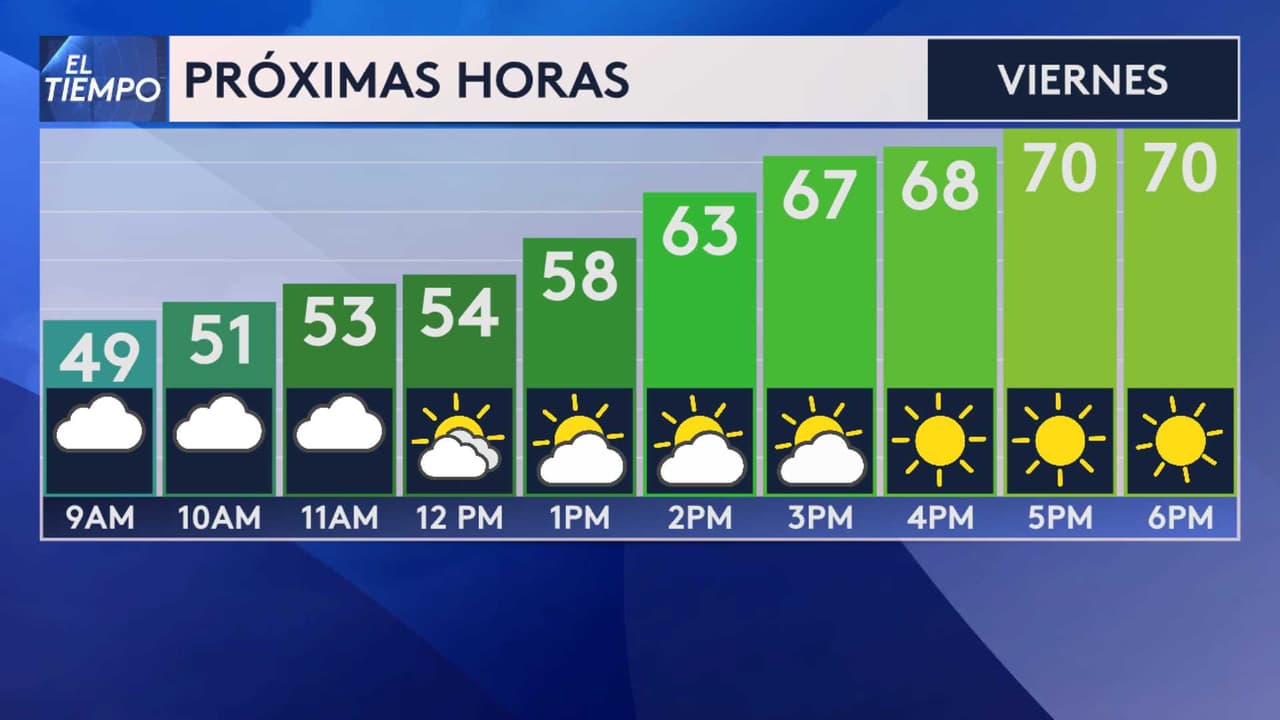 Prepárate para un viernes con temperaturas agradables, principalmente hacia la tarde. Para el fin de semana se esperan máximas alrededor de los 72 F y mínimas de 50 F.