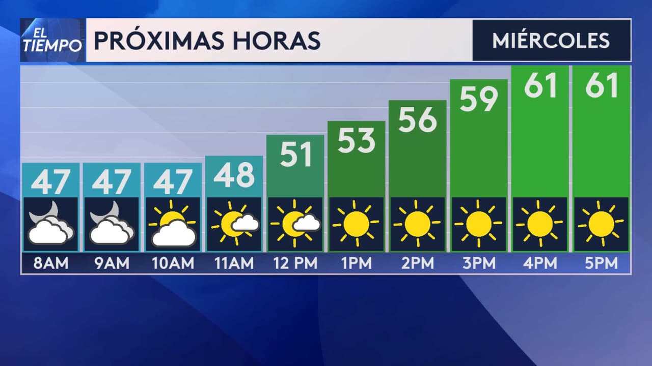 El pronóstico del tiempo para el Área de la Bahía indica que las temperaturas máximas alcanzarán los 60 F alrededor de las 4 pm, mientras que para la noche y madrugada se espera que el termómetro descienda hasta los bajos 40 F.