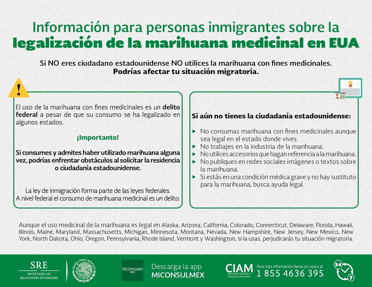 El Consulado recordó a sus connacionales que las leyes de inmigración forman parte de las leyes federales y que, a nivel federal, el uso del cannabis aún de manera medicinal está tipificado con un delito.