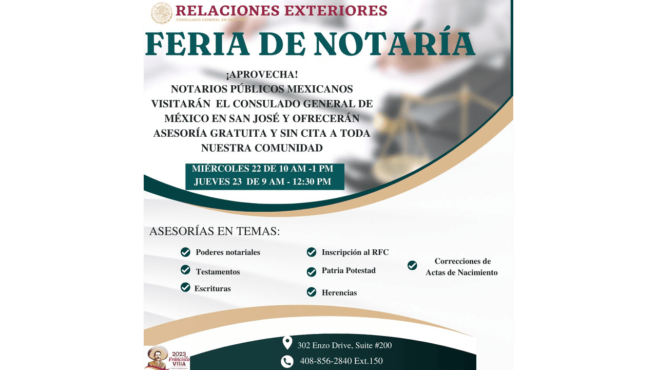 SAN JOSÉ, CA.- El Consulado General de México en San José anunció la realización de la Primera Feria de Notaría en la cual se brindará asesoría y orientación gratuita en el ámbito notarial a la comunidad mexicana asentada en la región.