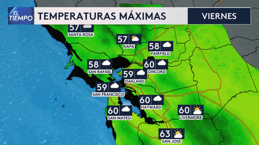Permanecerán los nublados con probabilidad de algunas lluvias hacia los condados de Marin, Sonoma y Napa. Mientras tanto, el resto de la bahía estará mayormente nublado con momentos de sol y temperaturas en los 57 F hacia Santa Rosa y 63 F en San José.