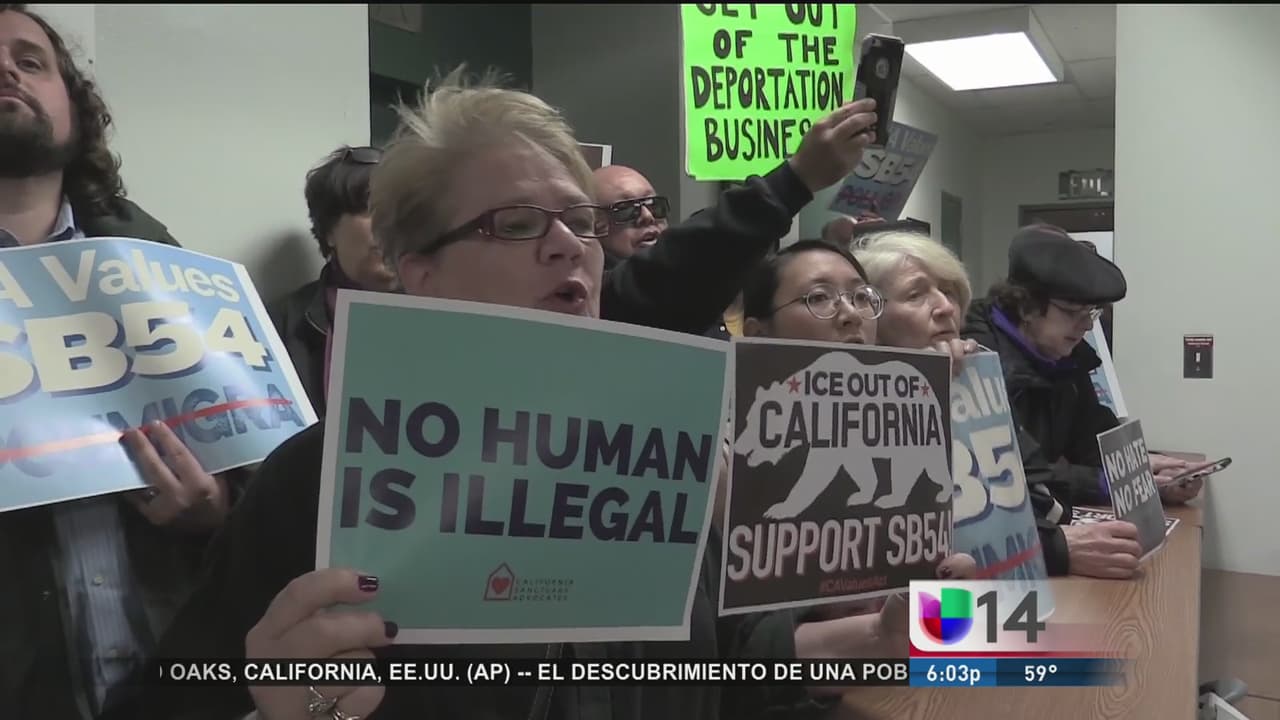 Un grupo de alrededor de cuarenta manifestantes protestó en las oficinas del alguacil por oponerse a la iniciativa SB 54.