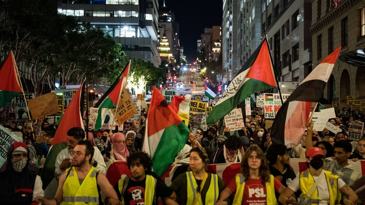 Este martes, cientos de manifestantes pro Palestina se reunieron en la Avenida Market de San Francisco, a pocas calles del Moscone Center donde se lleva a cabo la cumbre APEC. Las protestas finalizaron en el Merchant Exchange Club, al que acudió el presidente Joe Biden y la vicepresidenta Kamala Harris para reclamar el apoyo que Estados Unidos da a Israel en el conflicto en la franja de Gaza.