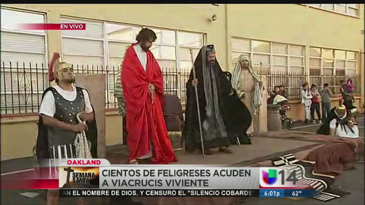 Cientos de fieles se dieron cita en la iglesia de Santa Isabel, en Oakland, donde se realiza una representación en vivo del viacrucis.