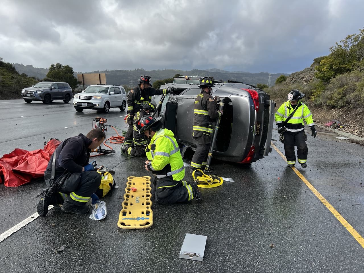 Bomberos del condado de San Mateo, personal de la Patrulla de Caminos de California, división Redwood City, y paramédicos de American Medical Response acudieron al rescate.