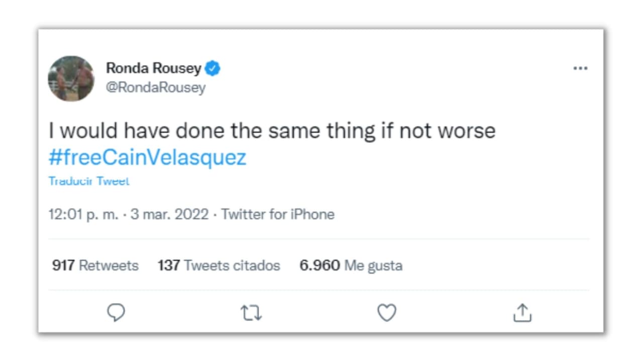 En su mensaje añadió la etiqueta #FreeCainVelasquez (liberen a Caín Velásquez), con la que sus fans están demostrándole su apoyo.