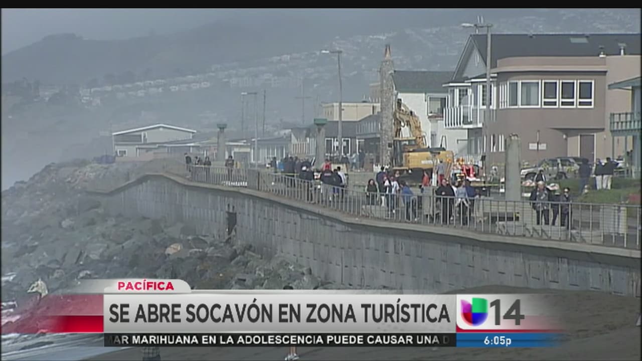 Tras las fuertes lluvias se abrió un socavón en Pacífica, en el malecón que corre a la orilla de costa, por lo que autoridades piden extremar precauciones ente las inundaciones.