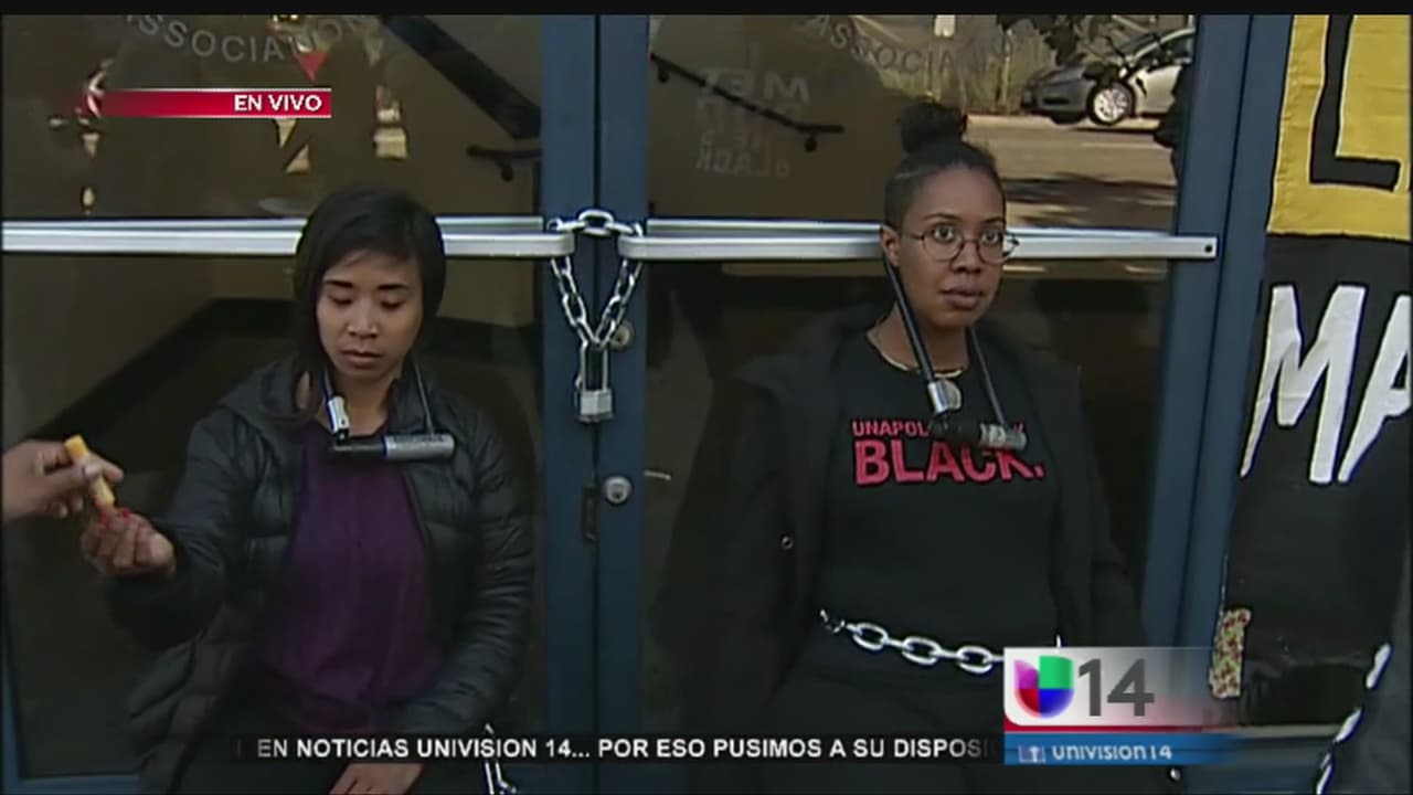 Integrantes de “Black Lives Matter” se encadenaron a las puertas de la Asociación de Policías de Oakland.