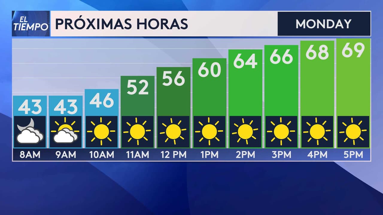 Durante este lunes dominará un sistema de alta presión, con cielos mayormente despejados y temperaturas máximas en el rango de los 70 grados.