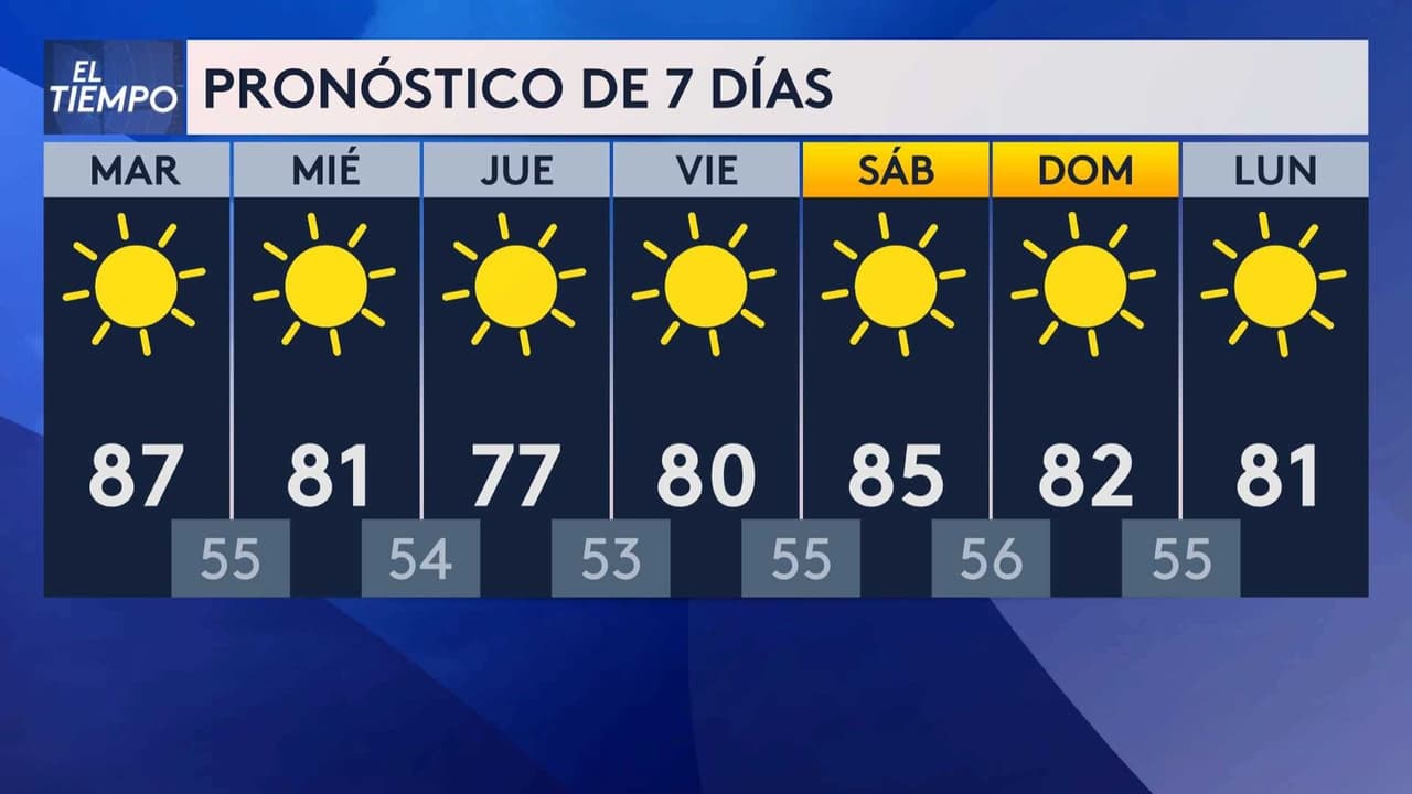 Para este día se esperan cielos mayormente soleados y temperaturas máximas en los altos 80 grados F.