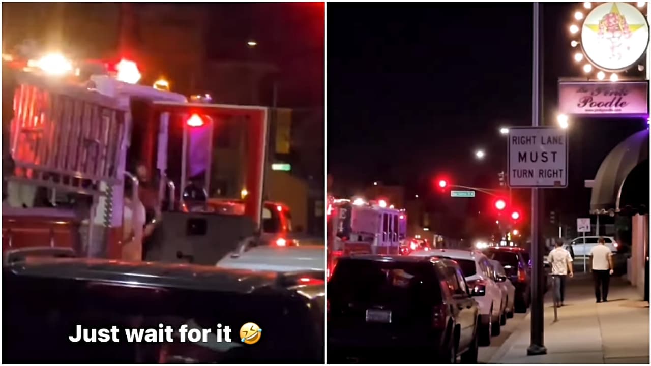 En el video se observa a una mujer en bikini abriendo la puerta del camión de bomberos con las sirenas encendidas, descender de la unidad y entrar a The Pink Poodle, un conocido club de bailarinas exóticas ubicado en el 328 de Bascom Avenue.