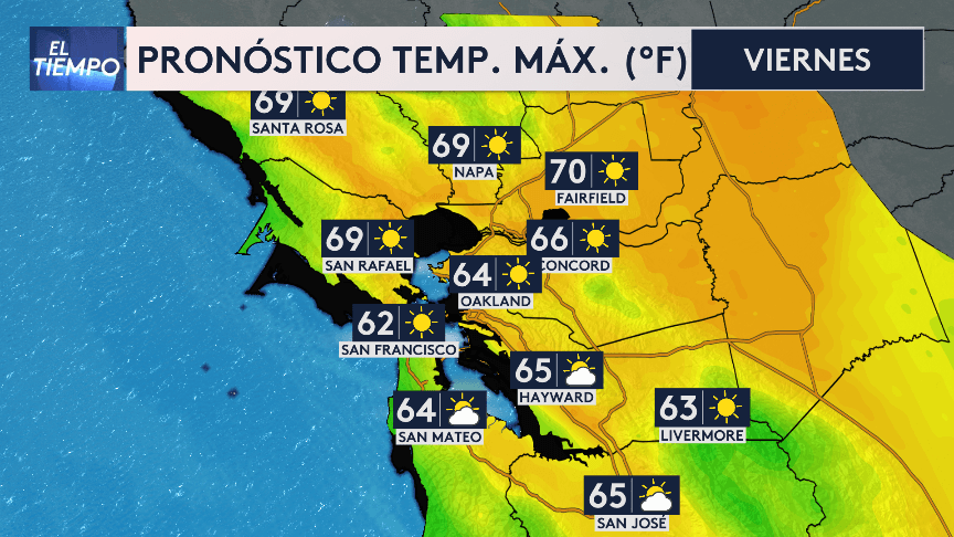 Durante la tarde las temperaturas ascenderán hasta los 69 grados en Santa Rosa y Napa, llegando a los 70 en Fairfield.