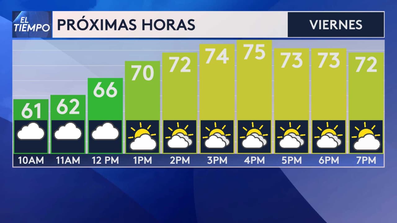 Se espera que alrededor de la 1pm el termómetro rebase la barrera de los 70 F y alcance sus máximas cerca de las 4pm.
