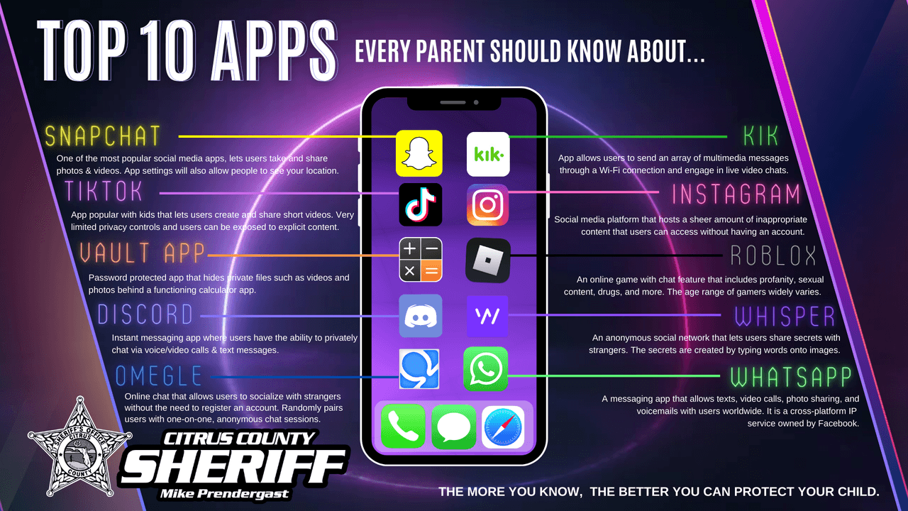 La Unidad de Delitos de Alta Tecnología de la Oficina del Alguacil del condado Citrus ha considerado las siguientes 10 aplicaciones donde hay mayor probabilidad de abuso, para que los padres tengan en cuenta: