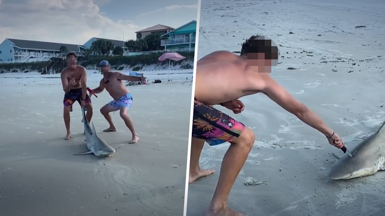 Uno de ellos comenzó a darle martillazos varias veces al animal en la cabeza y luego otro de ellos intentó liberar al tiburón arrastrándolo al mar.