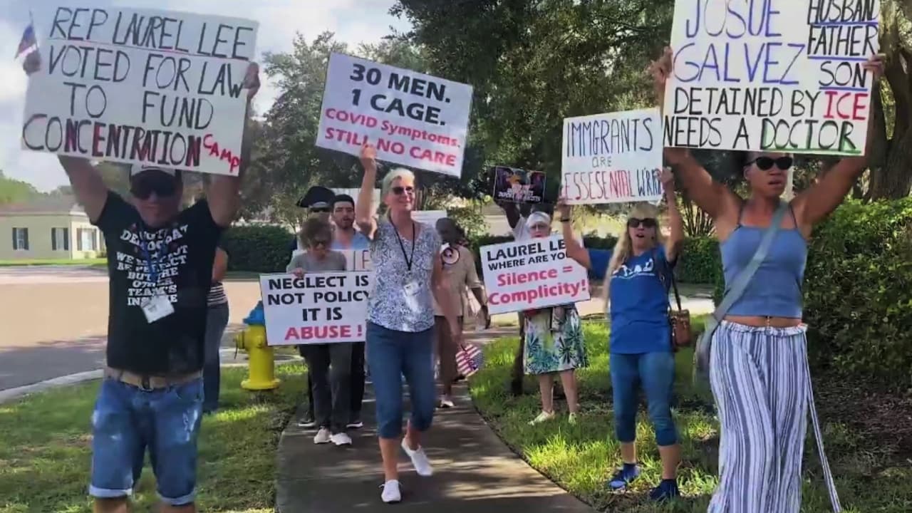 Manifestantes protestaron en la bahía de Tampa este viernes 29 de agosto para denunciar la falta de atención médica que necesitan varios inmigrantes que se encuentran en el Centro de Detención Alligator Alcatraz. Alrededor de 30 detenidos tienen coronavirus, informó Jose Lucena, de la organización Magnified Voces. “Solicito que me trasladen, he estado grave por el Covid", dijo Josué Galvez, uno de los arrestados.