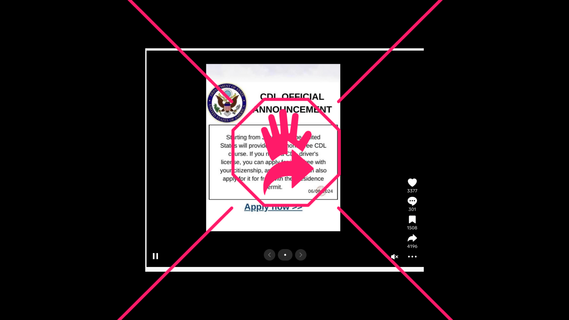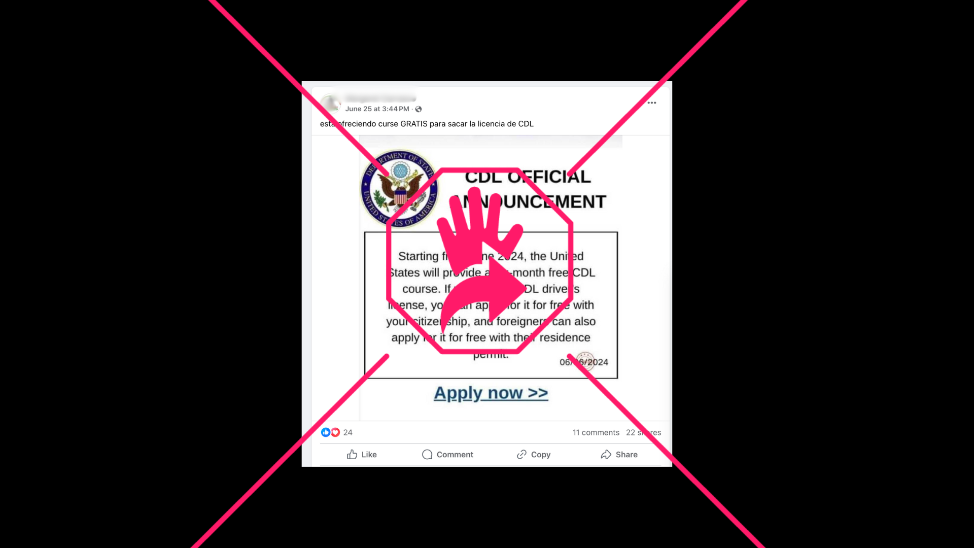 La publicación, que ha sido compartida 22 veces, además indica que si las personas necesitan “una licencia de conducir CDL, pueden solicitarla de forma gratuita según su nacionalidad. Los extranjeros pueden solicitarla de forma gratuita según su permiso de residencia". Sin embargo, el contenido, también compartido en TikTok, no incluye ningún enlace a pesar de hacer el llamado a "aplicar ahora".