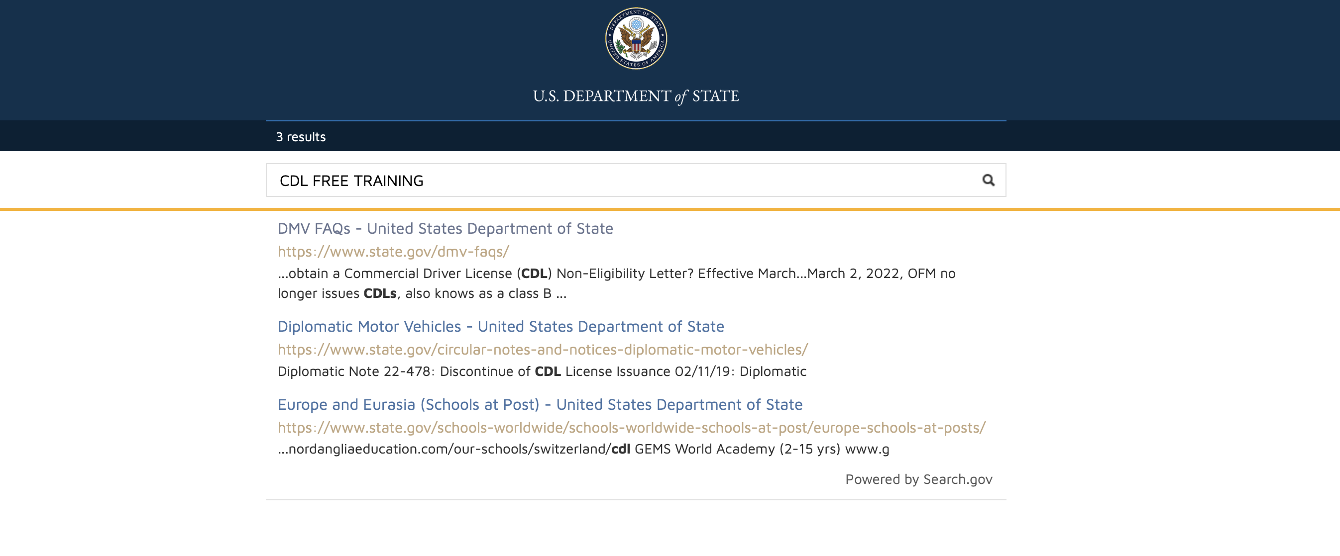 En el sitio web del Departamento de Estado de Estados Unidos realizamos una búsqueda con las palabras en inglés “CDL entrenamiento gratis” y, entre los resultados, no encontramos el supuesto anuncio oficial ni información que respalde la afirmación promovida en el anuncio publicado en Facebook.