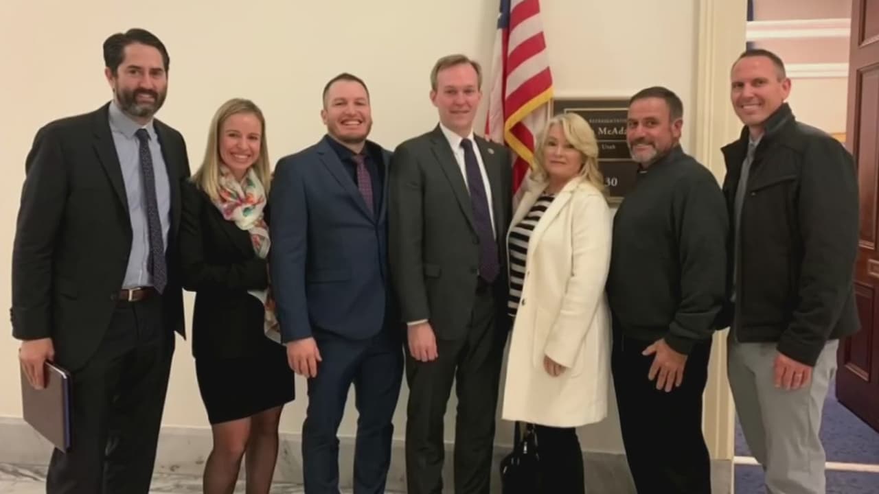 La familia LeBaron posa con el senador de Utah Mike Lee en su oficina en el Capitolio.