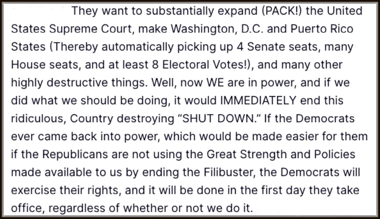 Trump enfocó sus expresiones en el actual cierre de gobierno y por qué los republicanos en el Senado deben eliminar la ley del filibusterismo, que exige 60 votos para un acuerdo. De los 100 senadores, los republicanos suman 53; los demócratas 45 y 2 son independientes.