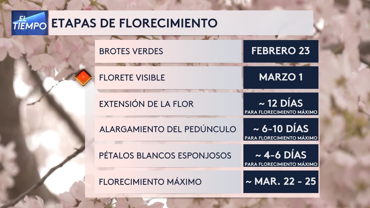 El Servicio de Parques Nacionales pronosticó el punto de florecimiento máximo de los cerezos en flor del Tidal Basil de Washington DC entre el 22 y 25 de marzo, pero previamente deben pasar por cinco etapas.