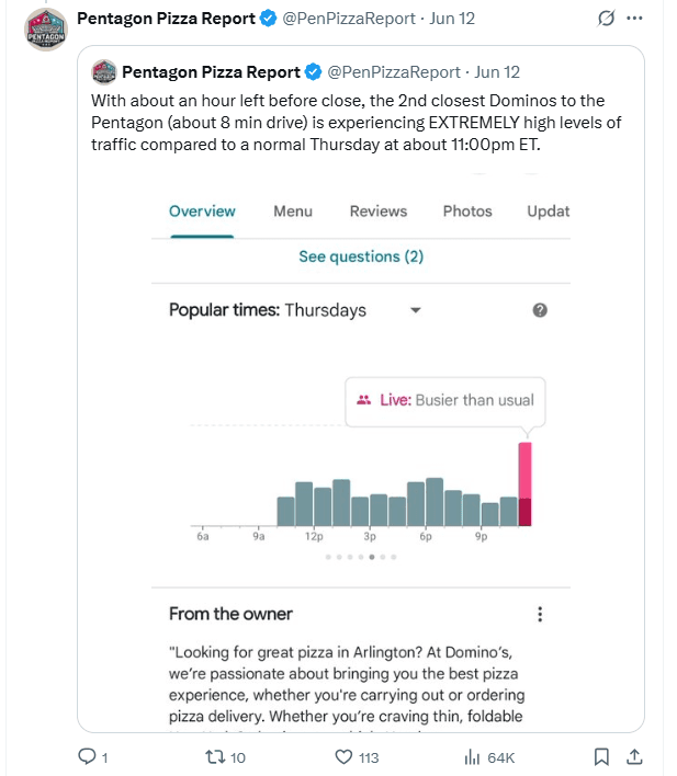 El pasado jueves por la noche, mientras Israel iniciaba ataques en zonas cercanas a Teherán, la cuenta compartió que una sucursal de Domino's Pizza, ubicada a 8 minutos en auto del Pentágono, reportó una alta demanda de pedidos.