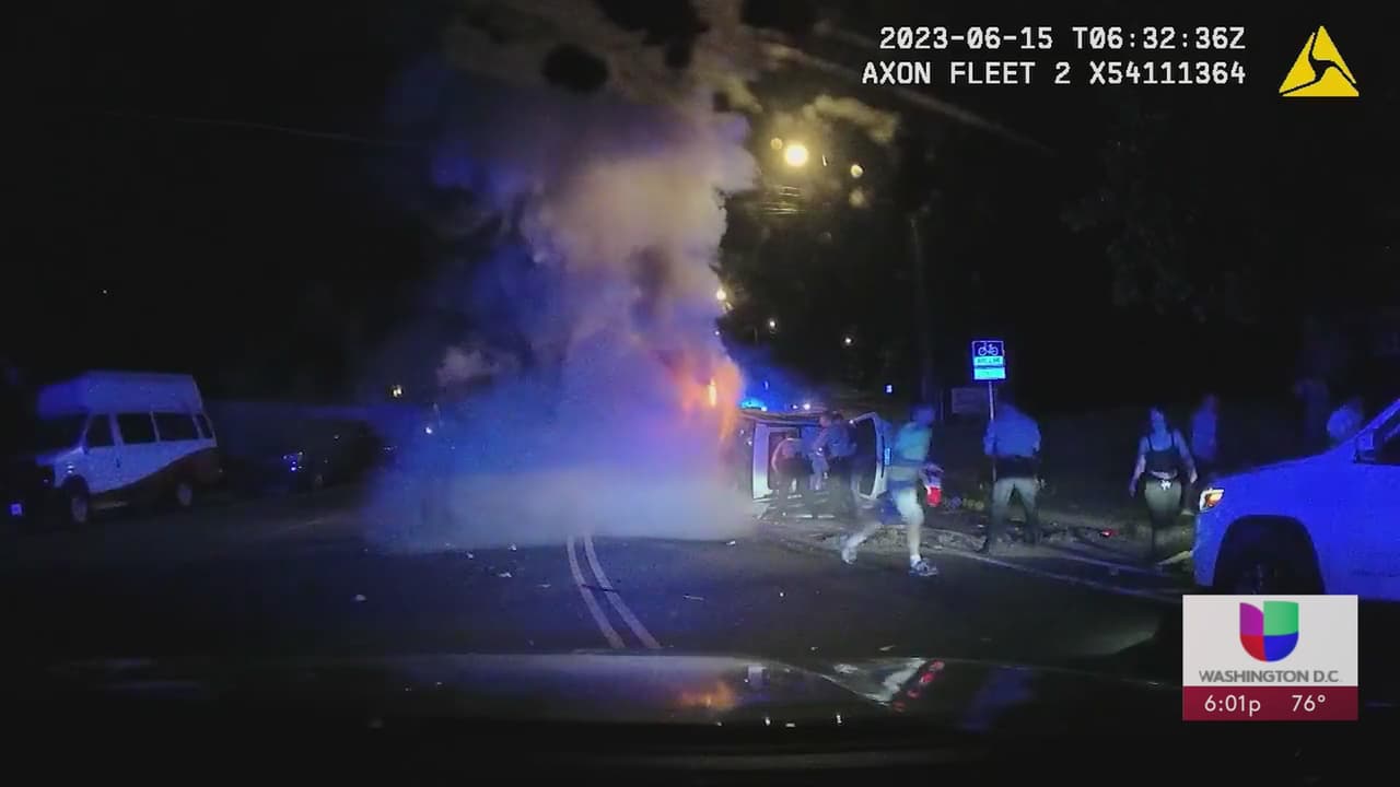 La policía de Fairfax recién reveló las imágenes del rescate de un hombre de 27 años, quien pudo ser sacado de un vehículo en llamas que se estrelló contra un poste y un árbol antes de volcarse. No se reveló la identidad del conductor, pero sí que fue arrestado por conducir en estado de ebriedad.