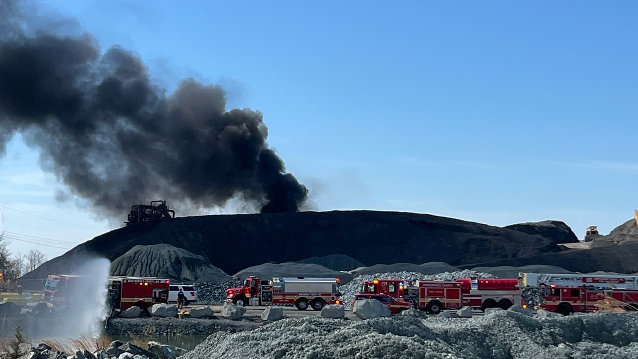 Bomberos y equipo de materiales peligrosos combaten desde alrededor del mediodía de este jueves un incendio en un sitio donde se fabrica asfalto en Montgomery. La columna de denso humo es visible desde distintos puntos del DMV.