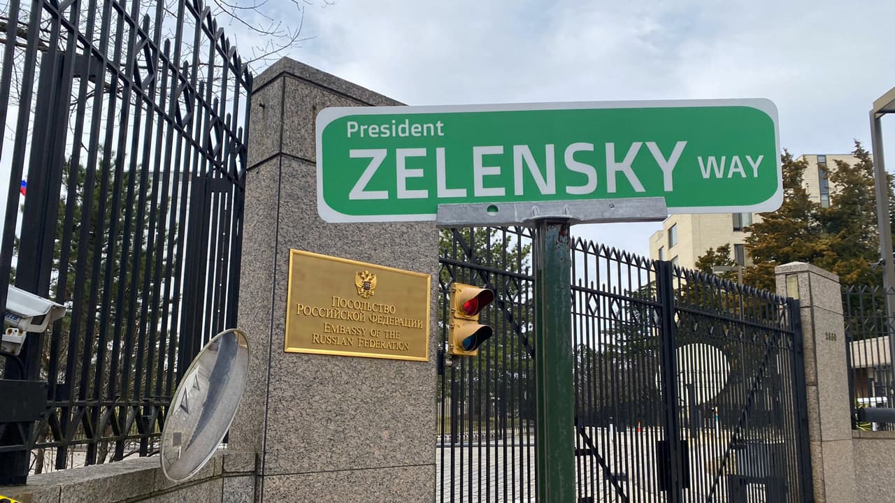 Colocan letrero de 'Calle Zelensky' afuera de la embajada de Rusia en Estados Unidos