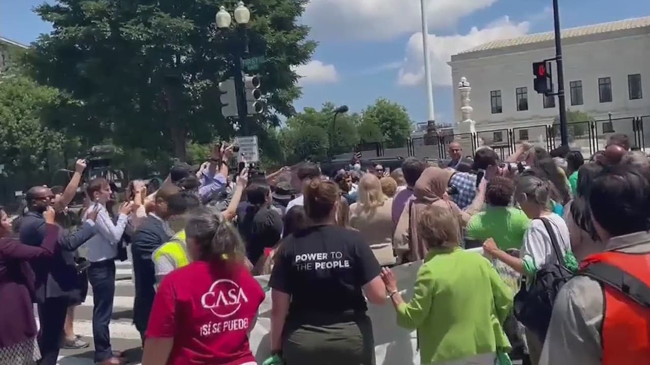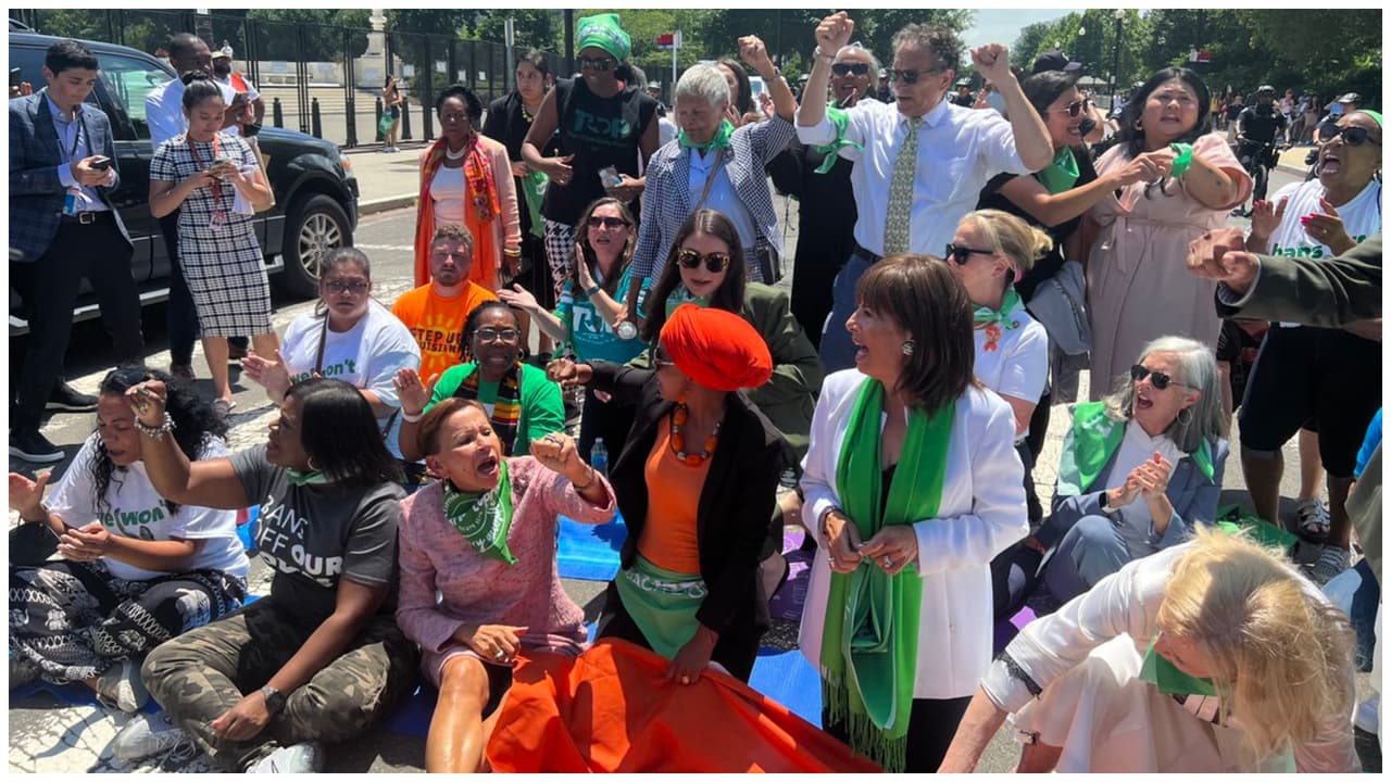 Las demócratas de la Cámara salieron del Capitolio y cruzaron la calle hacia la Corte Suprema gritando: "¡No vamos a retroceder!". Luego, el grupo se sentó en First Street NE fuera de la corte, bloqueando el camino, lo que provocó los arrestos.