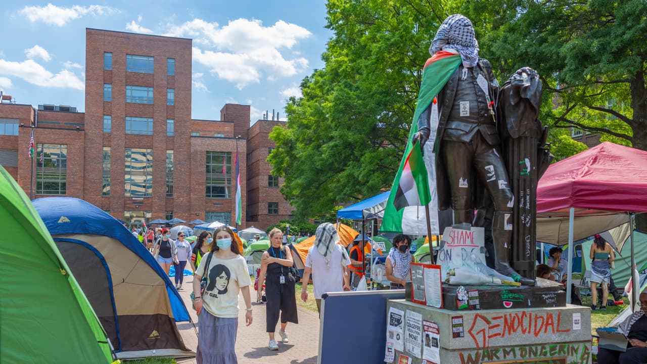 Este jueves se mantienen las protestas a favor de Palestina en el campus de la Universidad George Washington, en el Distrito de Columbia. Durante la jornada ha habido momentos de tensión, pues los manifestantes denuncian que la policía quería quitar la bandera palestina que ondea frente a la casa de estudios. Entretanto, otro grupo de estudiantes realizó una contraprotesta en apoyo a Israel, lo que ha caldeado los ánimos.