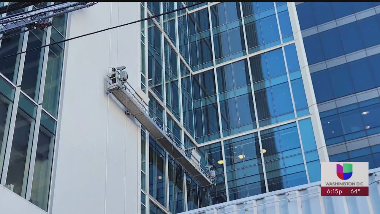 Tremendo susto: dos trabajadores quedan atrapados en un andamio en las alturas en Bethesda