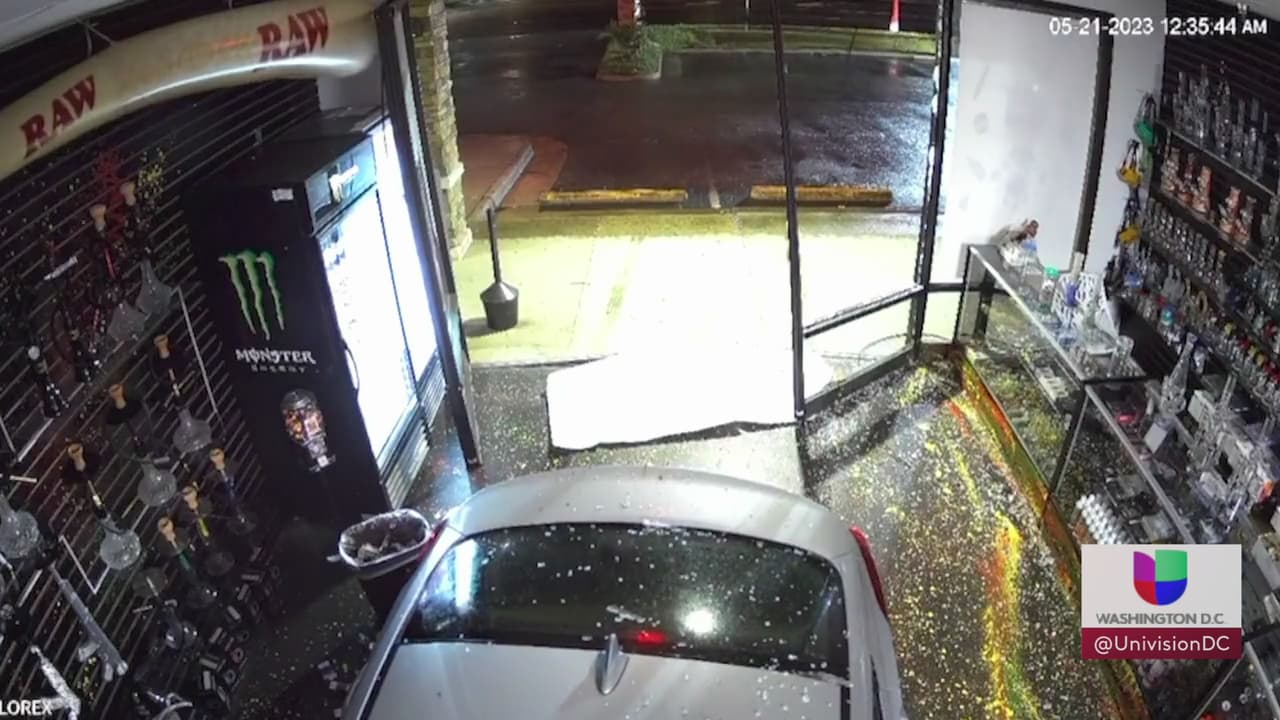 Cámaras de seguridad captaron el violento modo de operar de cuatro jóvenes de entre 15 y 20 años que utilizaron un vehículo Hyundai robado para estrellarlo contra un negocio y luego entrar a robar. La policía de Fairfax les sigue la pista.